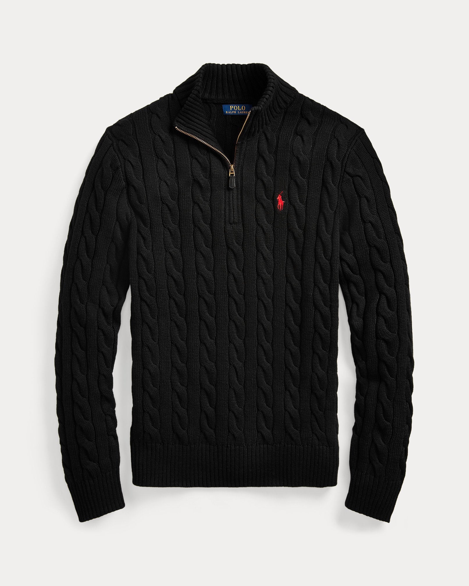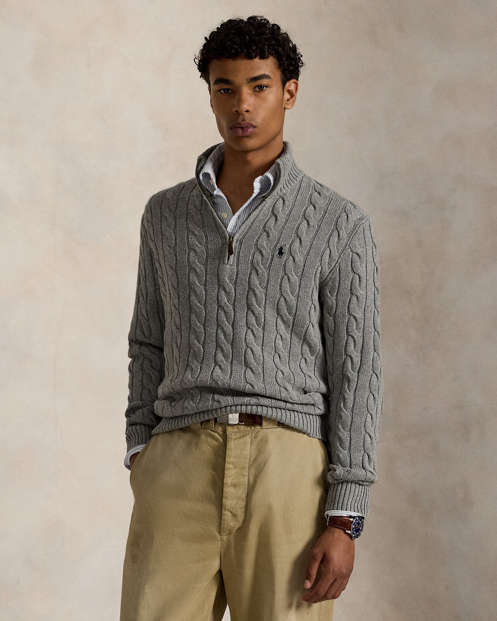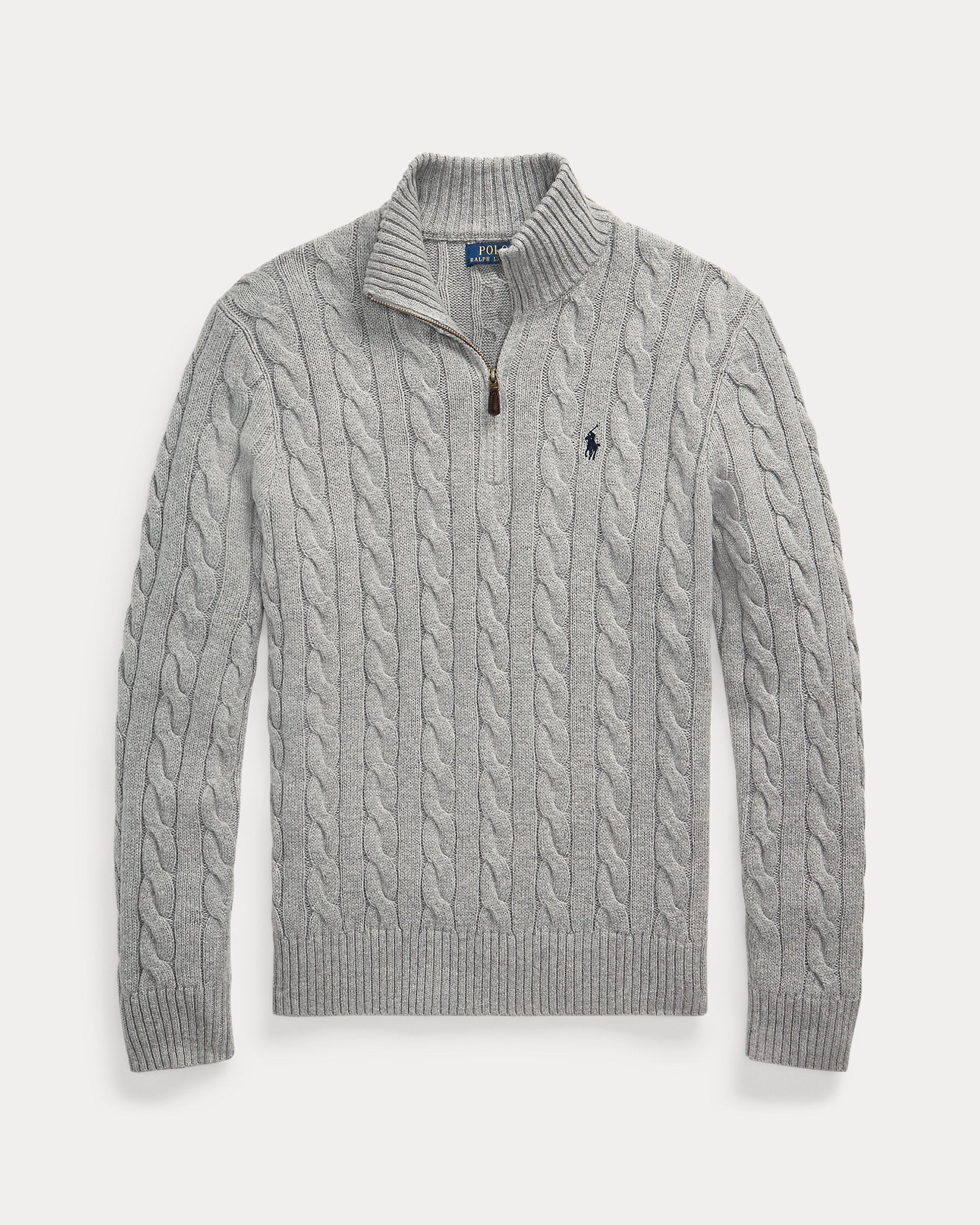 Det markanta flätmönstret har i årtionden varit en symbol för klassisk chic och ger denna tröja en unik, lyxig utstrålning. Den diskreta halvlåsta dragkedjan med ståkrage ger designen en modern touch och gör tröjan särskilt mångsidig: Bär den stängd för en elegant look på kyliga dagar eller öppen över en skjorta eller T-shirt för en avslappnad, sportig och elegant stil.